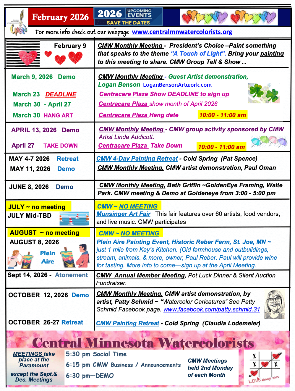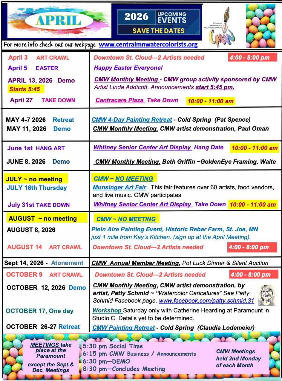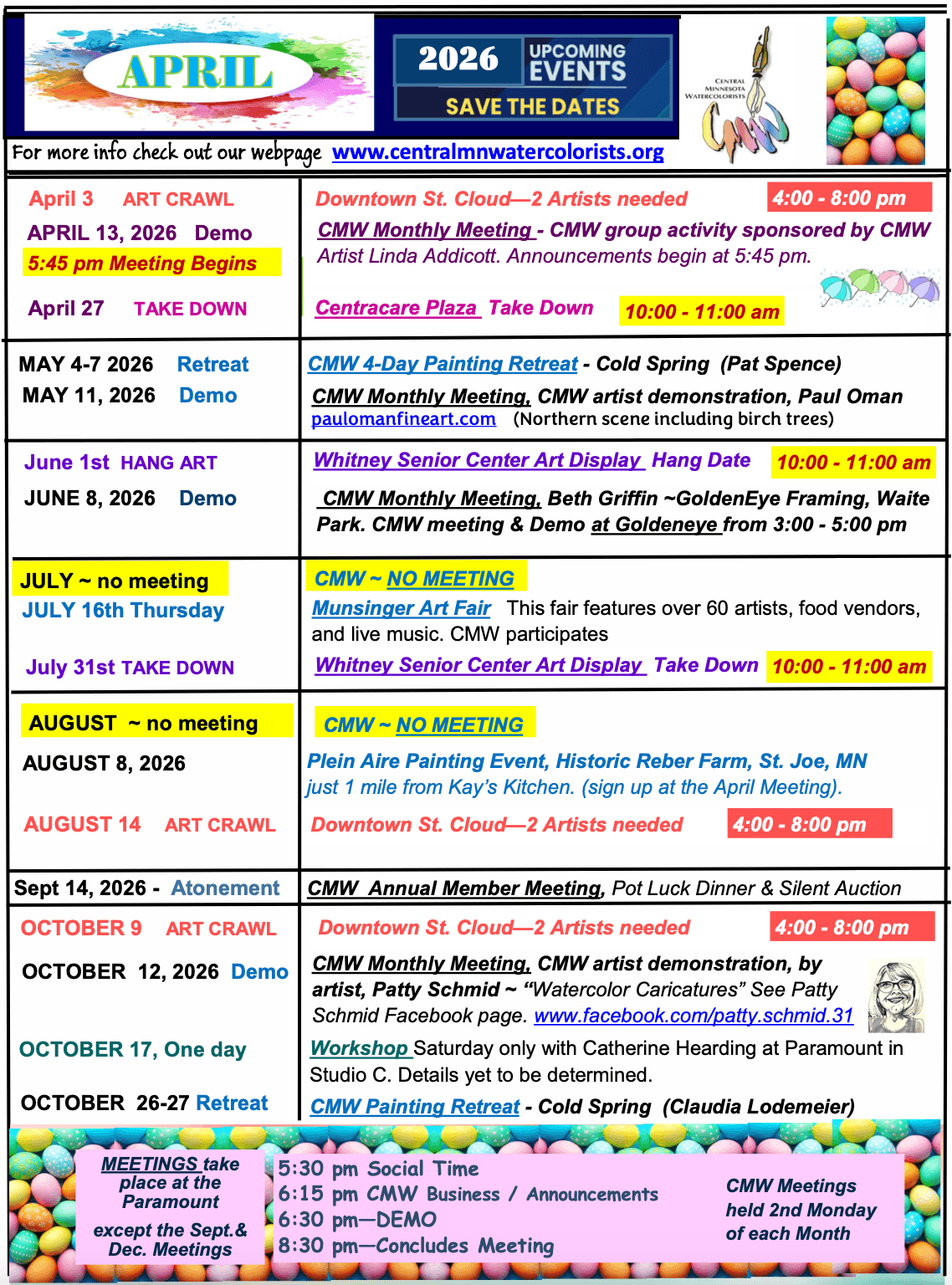 Central MN Watercolorists is an independent community-based organization based in St. Cloud, MN Area. Membership is open to all, from beginner to professional, who have an interest in watercolor and other water media. CMW membership provides opportunities to participate, meet, paint, learn, network, an exhibit art.