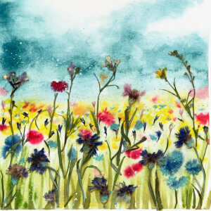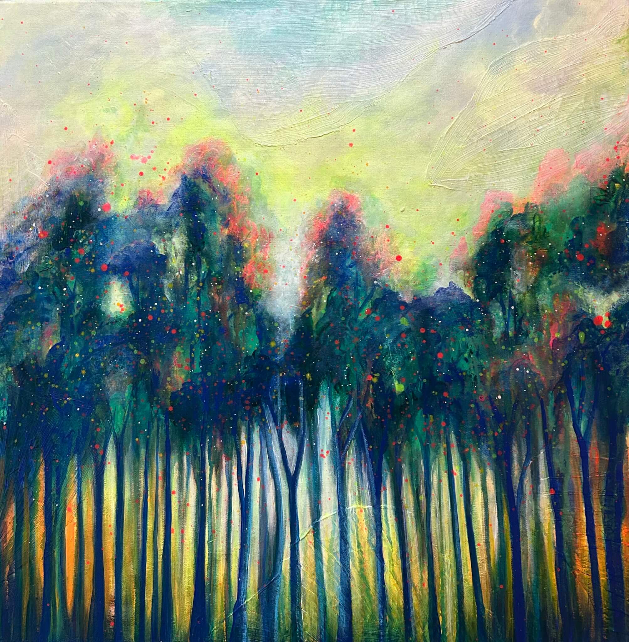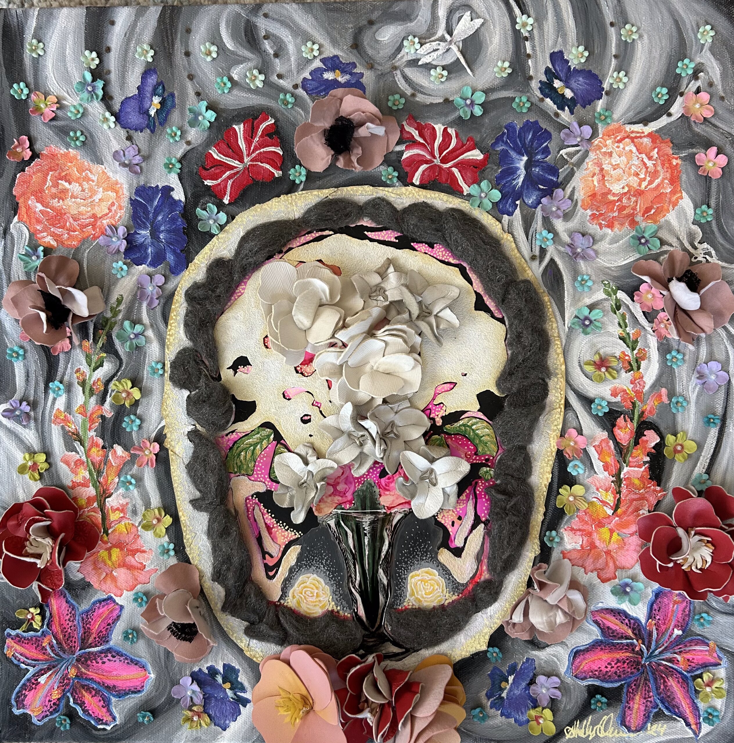 Her interest in making mixed media work evolved out of personal tragedies where she used art to process emotions and help her heal. She begins with a water media base of watercolor, alcohol inks or acrylic paint and then manipulates the surface by cutting, sewing or gluing layers of non-traditional textures such as dried flowers or leaves, tissue paper, steel wool, and sandpaper. Inspiration can come from the loss of a loved one or pet, a visit to a place of comfort or beauty, or a milestone; marriage, birth of a child, purchase of a new home among others but they almost always tie back to nature and our interconnectedness.